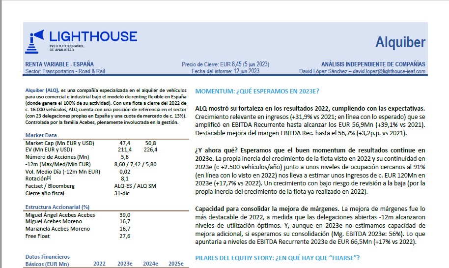 Os invitamos a echar un vistazo al informe en el siguiente enlace: Informe Small Caps – Lighthouse 2023. En la página 15 encontraréis las 6 compañías que han destacado como 6 grandes ideas de inversión. Además, en la página 34, veréis la nota correspondiente a Alquiber.