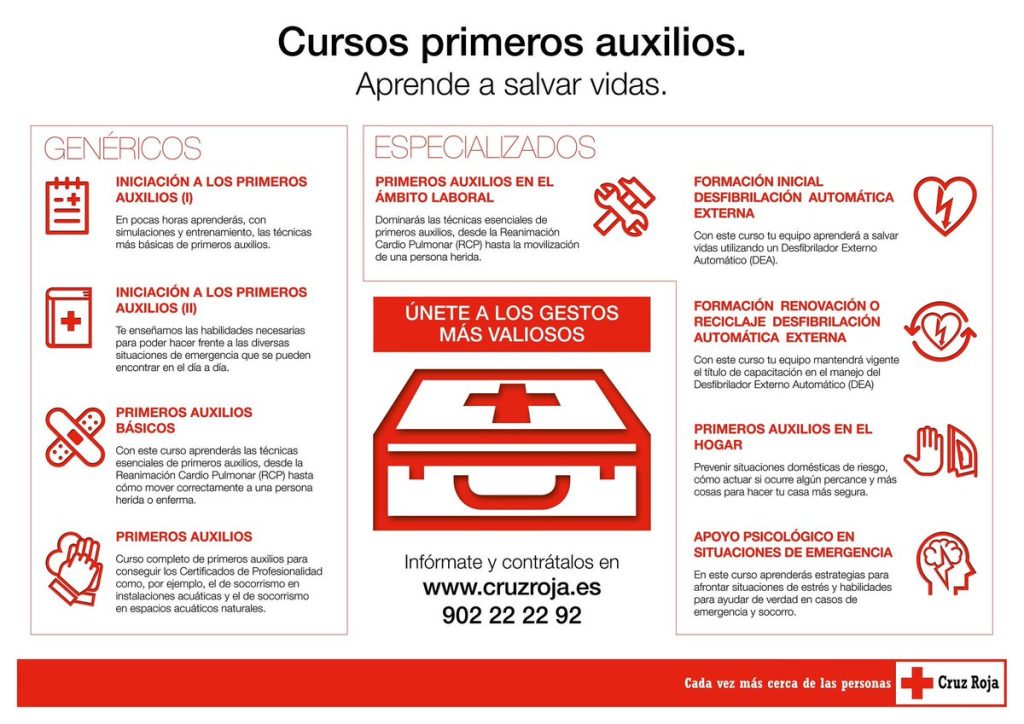 Cruz Roja ofrece una formación gratuita de primeros auxilios disponibles en su página web en el siguiente enlace: