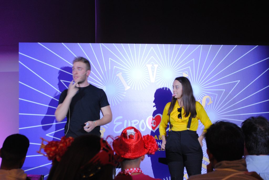 La gala comenzó con el desfile de participantes. Cada equipo de disfraces tomó el escenario para lucir su disfraz. Nos encontramos con varias Rosas de España, un Raphael en acción, rockeros de Noruega, a las Azúcar Moreno, un par de Nettas Barzilai, muchos eurofans españoles, bastantes lobos amarillos y hasta presentadores.