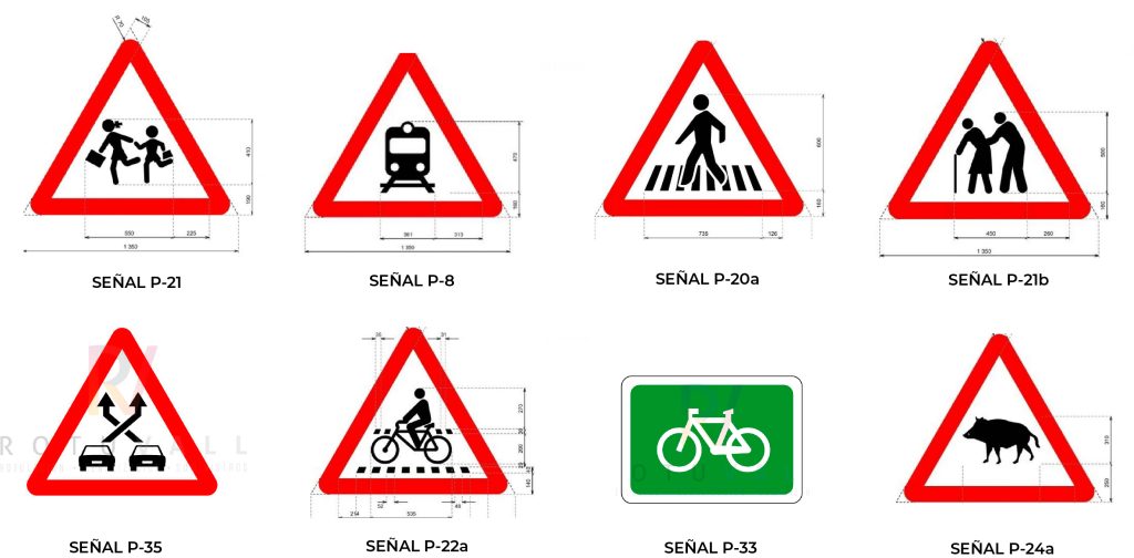 - Señal P‐8: informa del peligro por un paso a nivel sin barreras, actualiza su formato cambiando la locomotora antigua por una de aspecto más moderno.