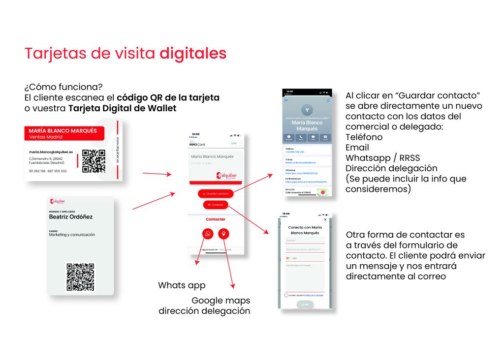 Además de las tarjetas físicas mejoradas, hemos implementado tarjetas digitales que todos los comerciales y gerentes podrán llevar en sus teléfonos móviles a través de la aplicación Wallet. Estas tarjetas digitales incluyen el mismo código QR, permitiendo compartir datos de contacto de manera rápida y ecológica en cualquier momento y lugar, sin depender de la disponibilidad de tarjetas físicas.