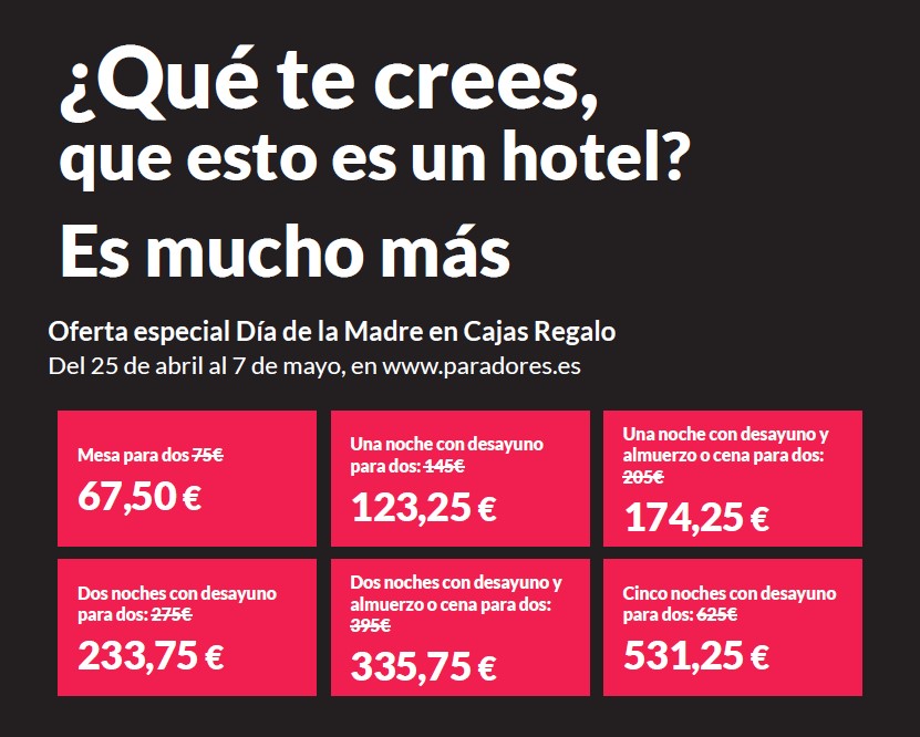 Además, con motivo del Día de la Madre, Paradores nos ofrece una promoción especial en todas sus cajas regalo para que hagáis el regalo perfecto a vuestras madres, o simplemente lo disfrutéis vosotros. No dejéis escapar esta oportunidad: