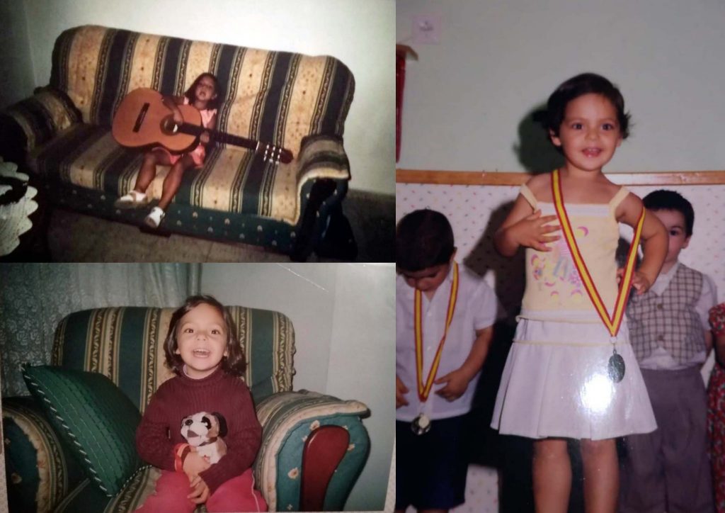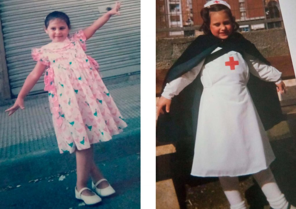 “Os adjunto varias fotos que reflejan un poco mi infancia, siempre feliz y apuntando maneras. Siempre he querido ser enfermera y ya de pequeña era mi disfraz favorito… Pero la edad del pavo y la física se me cruzaron en el camino… Mala combinación.
