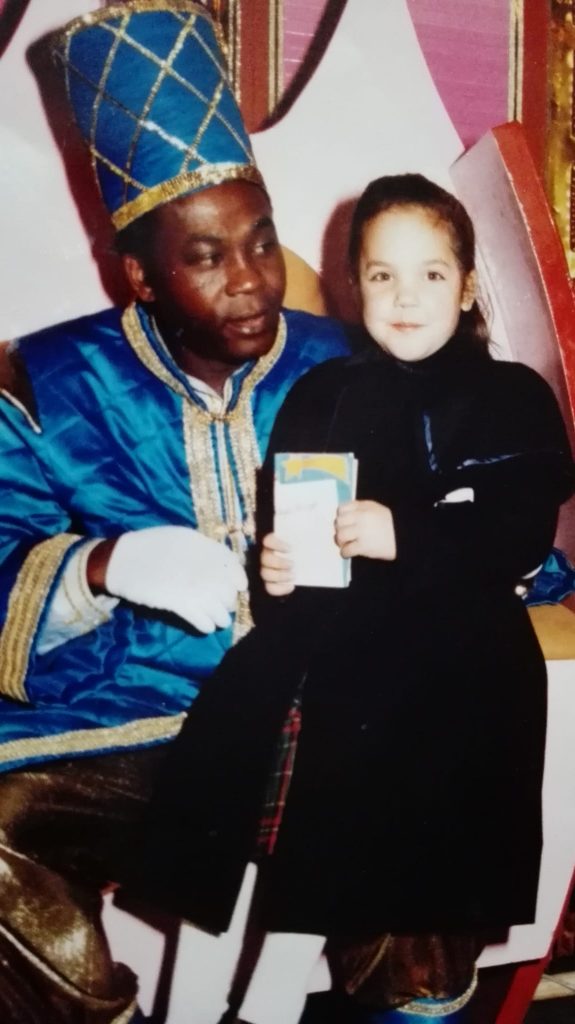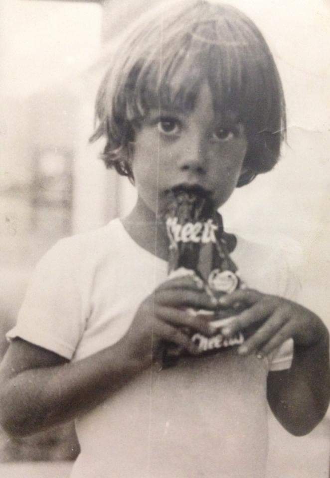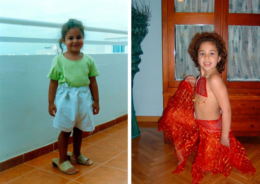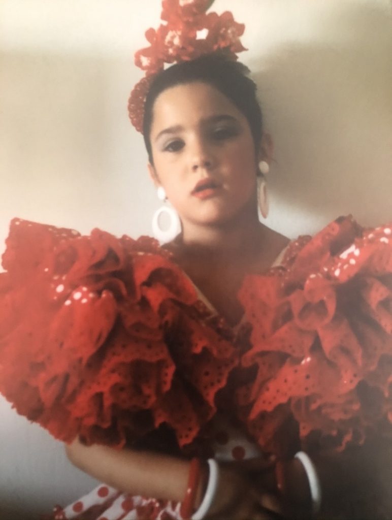 “De pequeña era bastante enfadona (cosa que ahora no, ¡eh!) y no me gustaba ser el centro de atención, ni en mi cumpleaños siquiera. A mi padre le gusta mucho la fotografía y antes de tener hermanos, siendo hija única mi padre gastaba carretes y carretes en hacerme millones de fotos. Este es uno de esos momentos en los que estaba hasta el gorro de fotos y me quería ir ya a la Feria. Quién lo diría … Con lo que me gusta ahora una foto y un postureo…”