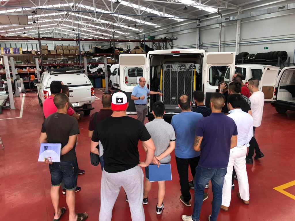 Posteriormente, tras la pausa para comer, intervino Rehatrans, proveedor de vehículos adaptados para PMR (para personas con movilidad reducida). Además de hablar sobre el tipo de adaptaciones posibles en los vehículos de Alquiber, se incluyeron nociones básicas de mantenimiento y funcionamiento de las elevadoras y del escalón lateral eléctrico. También se hizo hincapié en la importancia de utilizar bien los espacios reservados para sillas de ruedas y los cinturones para sujetarlas para garantizar la seguridad de los pasajeros.