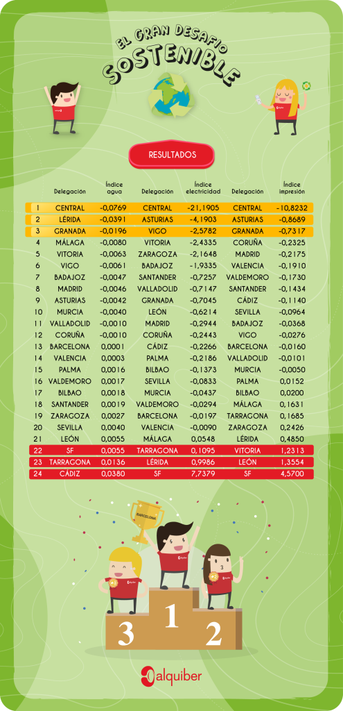 El equipo de Central se ha marcado un triplete. Lograron ahorrar más en el índice de agua, de electricidad y de impresión. Lérida estuvo muy cerca de conseguir el primer puesto en índice de agua seguido de la delegación de Granada. En cuanto al índice de electricidad, el segundo y tercer puesto se lo llevan nuestros compañeros de Asturias y Vigo respectivamente. Para finalizar, Asturias y Granada quedaron en segundo y tercer lugar en el índice de impresión. ¡Seguid así y conseguiréis el primer puesto!