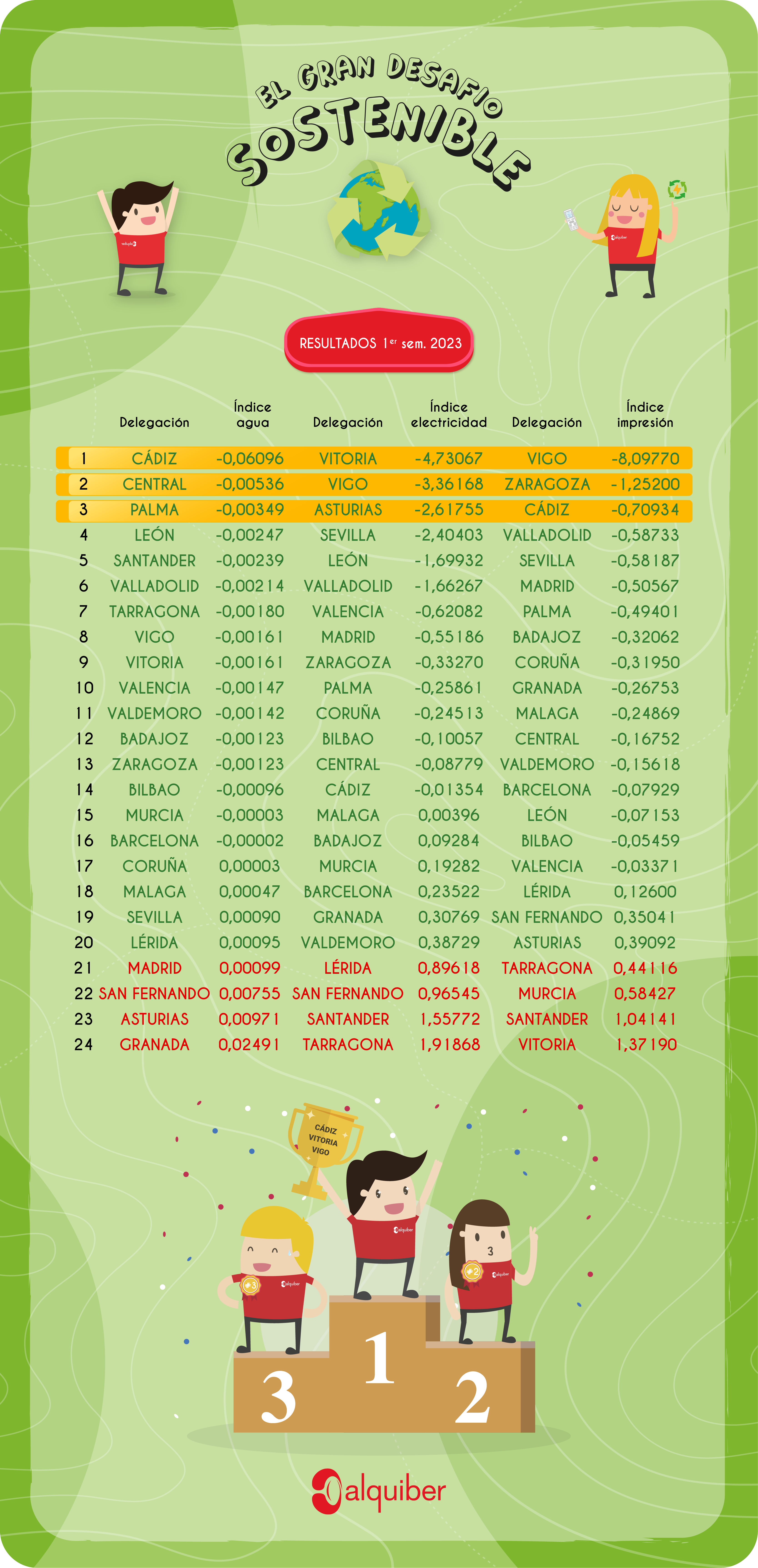 Desde el Departamento de Calidad, es un placer anunciar que tenemos los resultados finales del segundo semestre 2023 de “El gran desafío sostenible”. ¡Ha sido un período emocionante lleno de esfuerzo y compromiso por parte de todas las delegaciones!