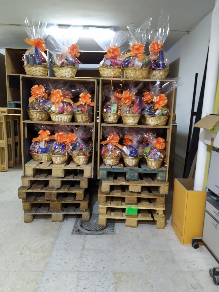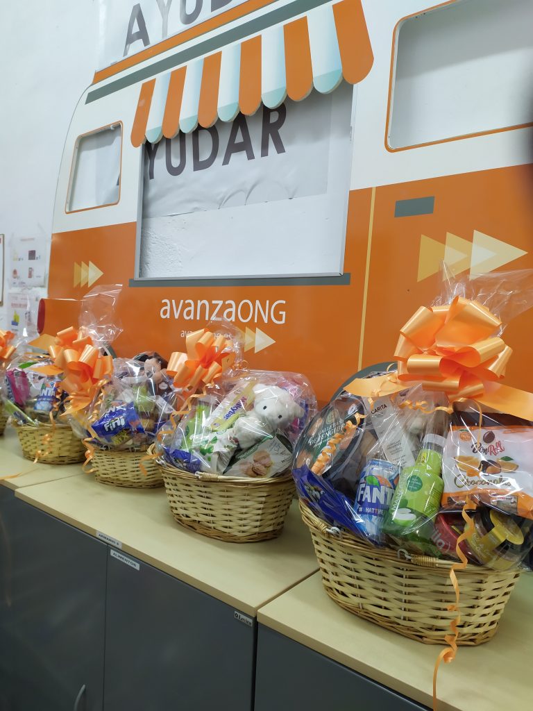 Con el propósito de ayudarles a conseguir este ambicioso objetivo, nuestros compañeros se trasladaron el pasado 20 de noviembre al almacén de Avanza ONG en Madrid donde disfrutaron de una divertida y agradable jornada elaborando cestas de Navidad. Entre los diferentes productos que incluían estas cestas, podemos encontrar un bote de legumbres, paté, chocolates, galletas, frutos secos, gominolas, sardinas, almejas, espárragos, atún, fuet, turrón, refrescos, peluches y diferentes productos de aseo y cuidado personal.